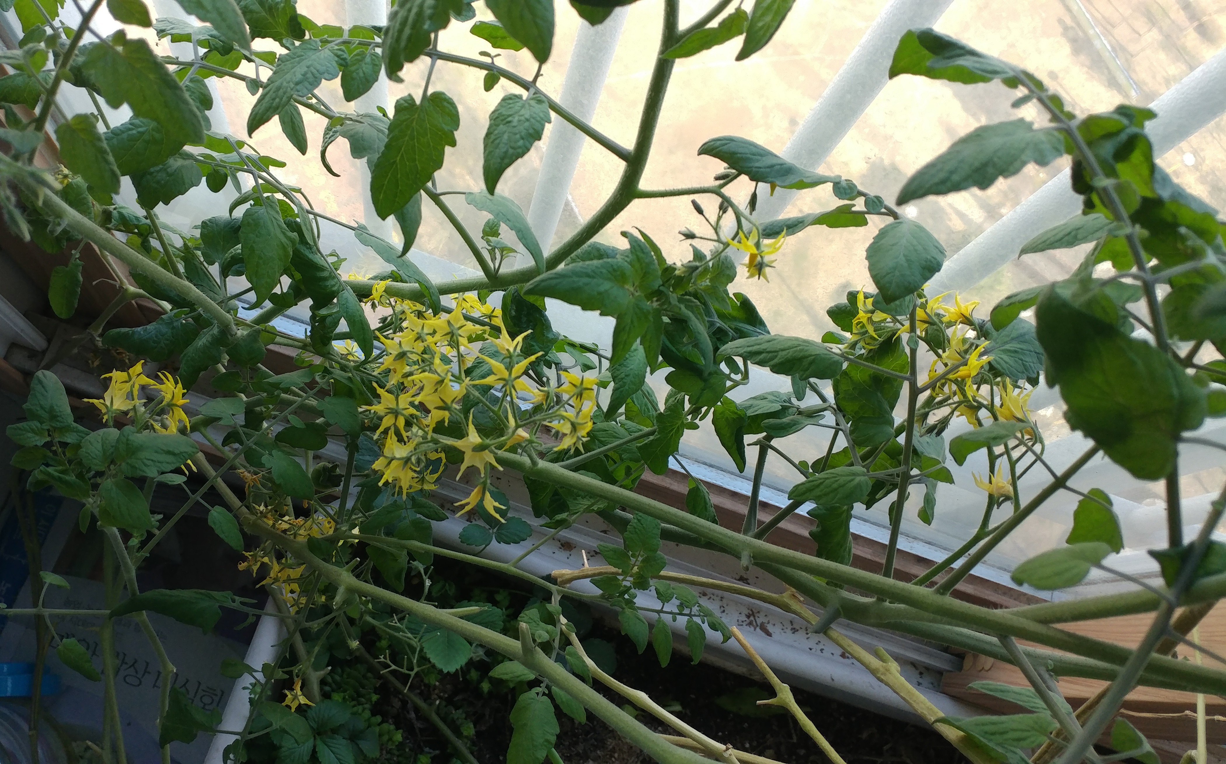 집에서 키우는 방울토마토, 바질, 파, 상추가 꽃을 피웠어요.