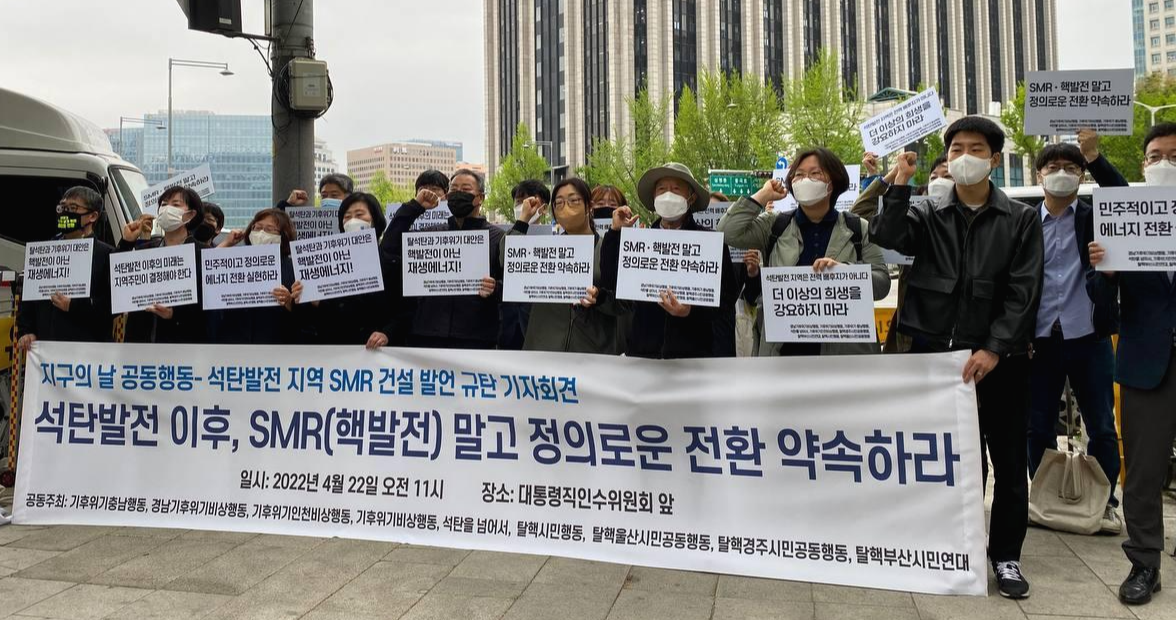 이에 지구의날(22일)과 체르노빌 핵발전소 사고 36주기(26일)를 맞아, 석탄발전 지역과 핵발전 지역의 시민사회단체, 기후운동, 탈석탄운동, 탈핵운동 연대기구 등이 공동으로 인수위원회 앞에서 핵발전 설치 발언 규탄 기자회견을 진행했다. 이 기자회견을 통해서 석탄발전 이후의 미래를 지역주민 스스로가 결정할 수 있게 해야 하고, 기후위기의 대안은 핵발전이 아니라는 점, 그리고 민주적이고 정의로운 에너지전환이 필요하다는 점을 밝히고, 인수위에 의견을 전달했다.