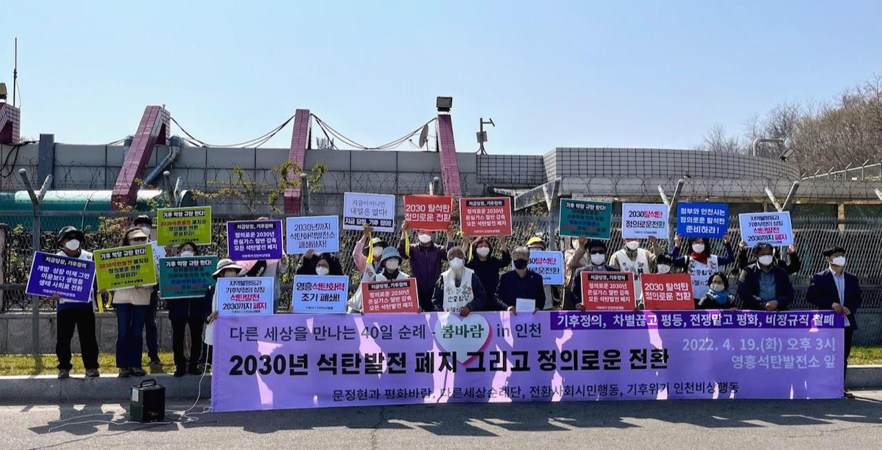 19일 영흥 석탄발전소 앞에서 인천비상행동은 문정현 신부의 '다른 세상을 만나는 40일 순례 - 봄바람'과 함께 영흥 석탄발전 2030년 폐지와 정의로운 전환을 위한 기자회견을 진행했다.